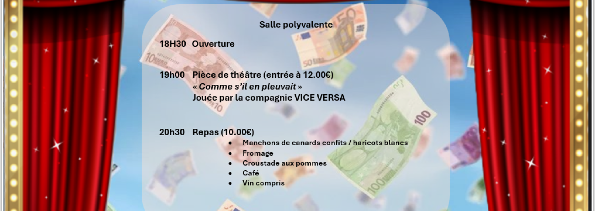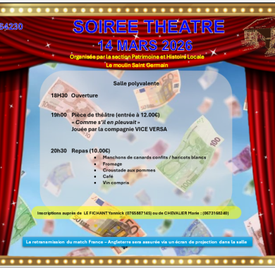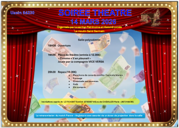 à 19 h début de la pièce de théâtre, puis repas concocté par les membres de la section avec possibilité en même temps de visionner la finale du tournoi des 6 Nations France Angleterre